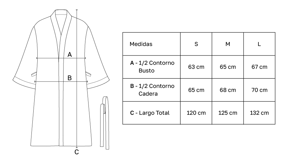 Bata larga confeccionada en satén de calidad premium, de textura suave y caída fluida. Se presenta abierta al frente con lazo para un ajuste cómodo y elegante.